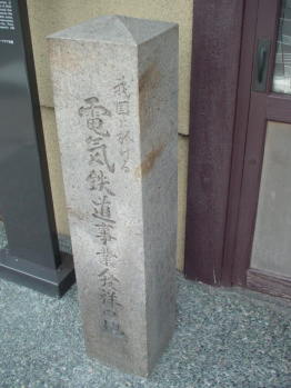 「駿河屋本店」前(京都市伏見区下油掛町169)に「電気鉄道事業発祥の地」記念碑があります。