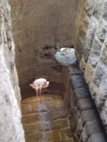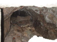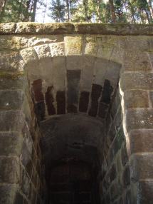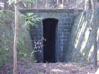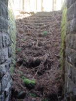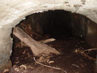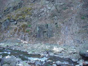 | 階段のいちばん下に、碓氷川へつながる水路のトンネルが設けられています。 発電に使った水を、このトンネルを通して再び碓氷川へ返していました。 このトンネルはカーブして、碓氷川に沿って下流側に開口しています。 |