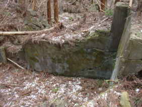 | 導水路出口から水圧鉄管までつながる水路の遺構 コンクリートでつくられた沈砂池?と間知石が積まれた水路 |