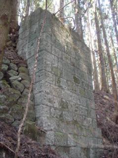 | 導水路出口と水圧鉄管の接続地点に谷を挟んで残る1対の切石積遺構 | |