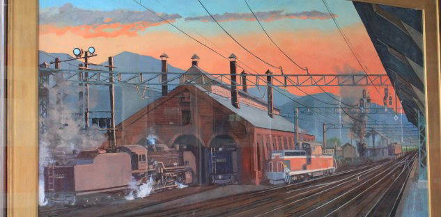 | 蒸気機関車時代の機関車庫の情景 | 機関車庫の壁面と窓の一部も保存されています。 |