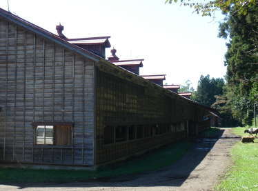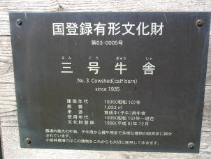 | 三号牛舎(犢(とく)牛舎) No.3 Cowshed(calf barn) since 1935 建築年代 1935(昭和10)年 規模 1023m2 用途 育成牛(子牛)用牛舎 使用年代 1935(昭和10)年〜現在 国登録有形文化財 第03-0005号 1996(平成8)年12月登録 |