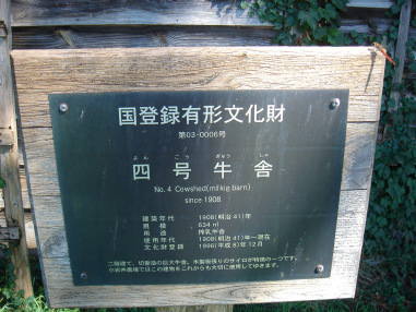 | 四号牛舎 No.4 Cowshed(milkig barn) since 1908 建築年代 1908(明治41)年 規模 633.6m2 (192坪) 634m2 用途 搾乳牛舎 使用年代 1908(明治41)年〜現在 国登録有形文化財 第03-0006号 1996(平成8)年12月登録 |