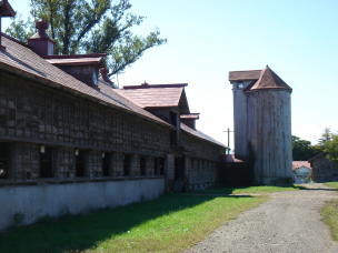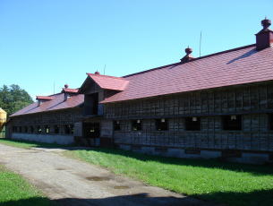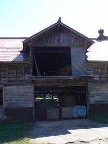 | 2階建て、切妻造の巨大牛舎。 木製板張りのサイロが特徴の一つです。 |