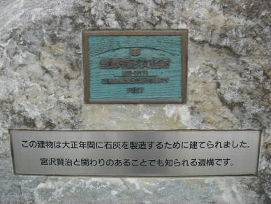 | 登録有形文化財 第33-0011号 この建造物は貴重な国民的財産です。 文化庁 この建物は大正年間に石灰を製造するために建てられました。 宮沢賢治と関わりのあることでも知られる遺構です。 |