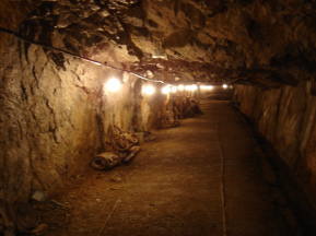 | 採石場から砕石工場までを、このトンネルの中に敷設されたトロッコ軌道で石灰石を運搬していました。 高屋栄助が鉱山で働いた経験を生かし、中心となって難関であった県道の下を通る隧道を完成させました。 |