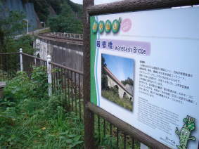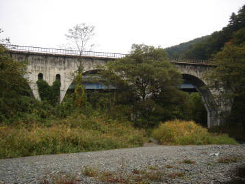 | 岩根橋・・・ この橋は正式には達曽部川橋梁といい、旧岩手軽便鉄道の鋼板桁橋、橋台、橋脚をそのまま鉄筋コンクリート、 カテナリーアーチとして中に包み込んだもので、昭和18年に改修され、平成14年には、土木学会選奨土木遺産 に認定されています。 宮守村には、宮沢賢治の童話「銀河鉄道の夜」のモチーフになったといわれる、有名な「めがね橋 (正式には宮守川橋梁)」がありますが、実はこの岩根橋がモチーフとされた、ともいわれています。 |