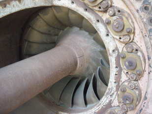 フランシス水車は、圧力の高い水が水車へ流入し、低圧となって流出する間に水のエネルギーを機械的エネルギーに換えます。中高落差の発電所で使われており、日本の発電用水車の多くがフランシス水車です。