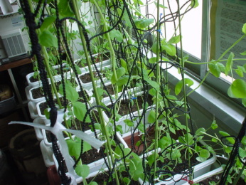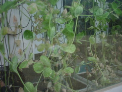 「つる」をからませるための支柱の代わりに、使わなくなったバレーボールのネットをつり下げました。
