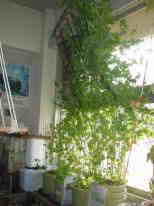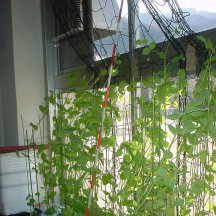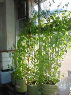 支柱は、あんどんづくり風になるように立てました。「つる」をぐるぐる巻いていくようにして、高さを低く抑えられるように考えています。もっと成長して問題が起きたら、また工夫したいと思います。