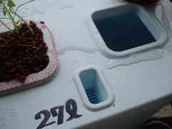 肥料水溶液をプランターへ・・・・肥料水溶液注入口&水位チェック用の穴が設けられています。