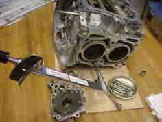 高トルクで締結されているエンジン ブロックのボルトは、トルクレンチを使 って外しました。 |