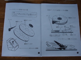 最近のスケルトンブーム?という流行の影響だけはでなく、このスケルトンハードディスクを見ながら、ハードディスクのしくみに興味をもってもらうためにという目的もあるようです。そのためこの製品には下の写真のような「のぞいてみようハードディスク」というA5サイズで6ページの冊子がついています。(2000年1月14日初版発行)