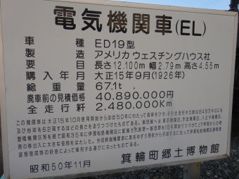 この機関車は大正15年10月使用開始からほぼ50年にわたって貨車をひき、その全走行キロ数は248万キロにも及び地球を62周するほどの長さを走りつづけたものである。飯田線へは東京機関区、作並機関区、八王子機関区、豊橋機関区等を経て昭和35年に伊那松島機関区に配属され辰野〜飯田間を15年間走りつづけて上下伊那からの物資の移出入に大きな役割をはたした。今回新鋭機関車に席をゆずり現役から引退するに当って伊那松島機関区静岡鉄道管理局等の好意によって陳列する運びになったものである。
