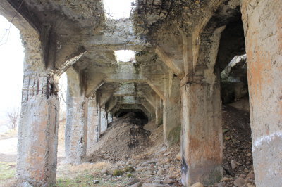 鉄鉱石を貨車に積み込むための施設(ホッパー)の基部、ホームの石積み、線路止めなどが残っています。