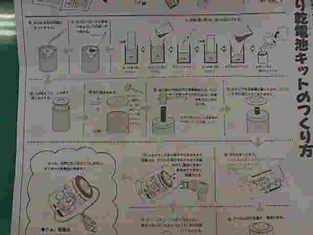 | 松下電器製の「手作り乾電池キット」!会場で「下さい!」と申し出たら一旦は断られましたが、しょんぼりしている姿を見かねてか、「じゃあ1つどうぞ・・・・」。担当者の方に感謝です(^^) このキットは電解液となる薬品(塩化アンモニウム)が二酸化マンガンに混ぜてある(合剤)ために、水を2cc加えるだけで済んでしまいます。熱収縮フィルム(チューブ)をつかってパックにするため、電解液が漏れる心配が少なくなっています。小学校低学年の子どもでも安全に乾電池づくりができるキットになっています。フィルムケースを使ったマンガン乾電池づくりを、技術科の学習ではやっていますが、こちらはマンガン乾電池のしくみや構造をしっかりわかってもらうために電解液を別に加える工程があったほうが良いでしょう。 説明書には、ボルタ電池や、現代の各種電池の解説があります。 |