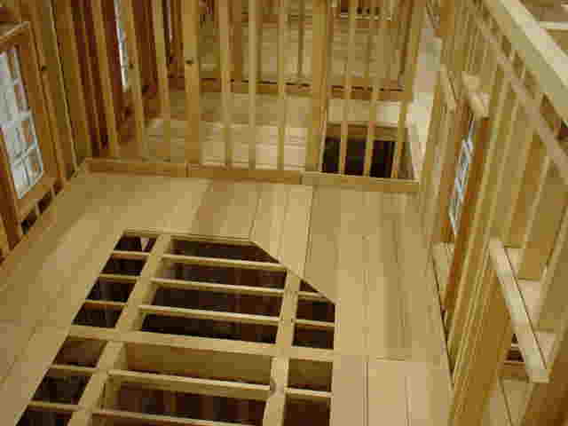 | 梁も形状がきちんと加工されています。小屋組が和風であるこの建物の特徴がよくわかります。 | 床の部分がカットモデル化されていて、建築構造がわかりやすくなっています。 | ブロンス格子や柱が丁寧に再現されています。 | 建築中の建物のようで、まるで中に入っていけそうなくらいリアル感があります。 |