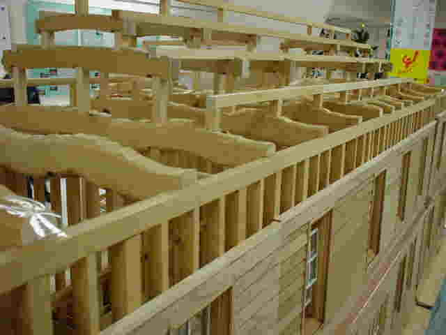 | 目地漆喰塗の屋根が出来るのが楽しみですね。 | 2階バルコニーの奥に貴賓室扉が見えます。 | 丁寧な模型つくりがよくわかります。 | 屋根裏部分の構造がわかりやすい。 |
