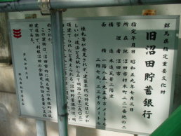 1898(明治31)年に開業した「沼田貯蓄銀行」は、1926(大正15)年に「利根銀行」と合併し、名称を「利根銀行」とし、この建物が本店となりました。その後も合併して、1932(昭和7)年には「群馬大同銀行沼田支店」となり、1934(昭和9)年には店舗としての役割を終えたということです。この建物は擬洋風建築であり、所有は沼田市と周辺町村共有ということです。