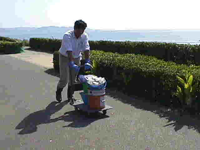 | サーフィンをしている人たちを横目に、海岸通り を長靴、ゴム手袋姿で台車を押す妙な人 ・・・・何を運んでいるのでしょうか?(^^)これ、 こう見えてすご〜く重いんですよ。 (小林君撮影) |