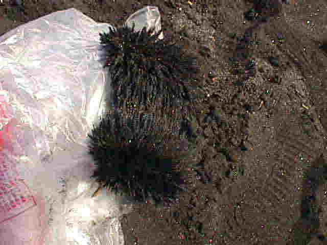 今回の砂鉄採集を手伝ってくれた東京・国分寺に住む旧友の小林君(・・・ほんとうに感謝!感謝!です)は、通りかかった人に「こんなところで、ウニを採っているのかと思ってびっくりしましたよ」と言われていました(^^)。確かに、磁石についた砂鉄は、そんなふうにも見えますね。この黒っぽいのが砂鉄だって気が付く人は、ほとんどいないでしょうね。