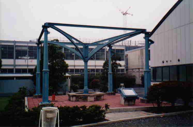 鋳鉄フレームの四隅の柱は、信越本線横川駅構内に架設されていた跨線橋の脚柱で、日本工業大学・工業技術博物館が日本国有鉄道から譲り受けたものです。
