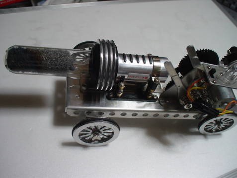 スターリングエンジン・カーとして走行させるときに、熱源を搭載していないため、この蓄熱器から熱エネルギーを得るわけです。