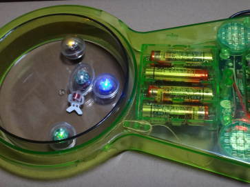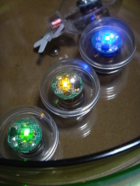 トレーに水を入れることができ、音楽を入力すると可動ユニット(LED赤)が尾びれを動かして泳ぎ始めます。