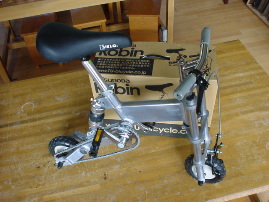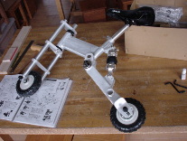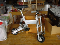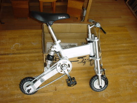 中学校・技術科での機械の学習に教具として使える、組立式の超小型自転車(タイヤサイズ6インチ・ただし18インチまでサイズアップ可能、カスタマイズ前の重量6.5kg)です。少し練習すると中学生なら乗りこなすこともできます。自転車というとあまりにも身近なものですが、ちょっと変わったこの自転車には生徒たちも興味を示してくれます。