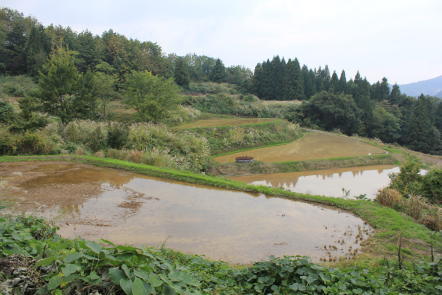 | 新潟県の東頸城地域では、棚田での稲作に天水(雨水、雪)を利用するため、稲刈り後の秋に「代かき」を行います。 秋も冬も田んぼに水をためたままにしておく「天水田(てんすいでん)」です。 |