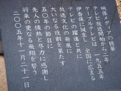 | 映像メディアの精華 テレビ放送開始から2年 ケーブルテレビは 1955年 伊香保に誕生し 全国に広まる テレビの躍進と共に 放送文化の発展に 大いなる役割を果たす 50年の節目に 先人の情熱と尽力に感謝し 将来の更なる飛翔を誓う 2005年11月21日 |