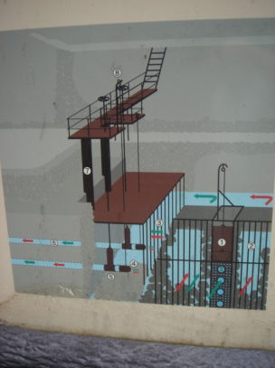 | 旧 青山取水口 この取水口は、明治30年(1897年)から大正4年(1915年)まで使用されていたもので、自然の地形を巧みに利用し、道志川の水を取り入れ、ポンプ等の動力を使わずに横浜へ送っていました。 この取水口の特徴は、洪水時に流れてくる大きな浮遊物を取り込まないよう工夫してあることです。 取水の方法 平常時 取水ゲート(1)の扉を吊り上げ、開けた状態で水を取り入れた。 洪水時 取水ゲート(1)の扉を下ろして閉じ、鉄柵(玉石詰)(2)の玉石の隙間を通して水を取り入れ、ごみ等のはいるのを防いだ。 各部の名称と役割 (3)スクリーン 木片など大きな浮遊物を取り除く (4)ストレーナー 木の葉や砂利等を取り除く (5)制水井 水の取り入れ量を調整する (6)導水管 取り入れた水を沈でん池に送る管 (7)波防管 導水管の空気抜きと取り入れる水を量る (8)操作架台 制水弁の操作やストレーナーの清掃等を行うところ 洪水時でも行えるように高い場所に設置した |