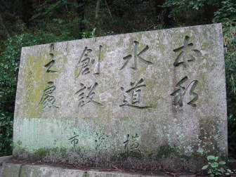 横濱市水道ハ英國人技師故ハーマー氏ニ委嘱シ水源ヲ北ノ地ニ索ノ明治拾八年四月起工シ同貳拾年九月竣成セルモノニシテ是レ實ニ本邦ニ於ケル新式水道ノ濫觴ナリ茲ニ其ノ五拾周年ノ記念ニ方リ之ヲ建ツ 昭和十二年十月 横濱市長 従四位勲二等 青木周三 |