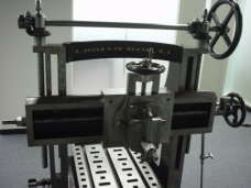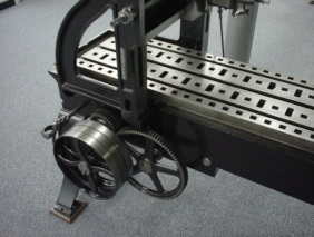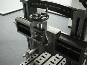 小型の平削盤(プレーナー)で、刃物が固定されていて、加工物を取り付けたテーブルが往復運動する基本的な構造がよくわかります。