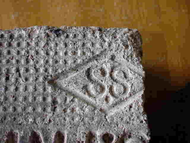 | 「品川白煉瓦会社」製 蝋石煉瓦(ろうせきれんが) 煉瓦表面の編目模様は、煉瓦を積み重ねる時にモルタルの付きを良くするためのものです。 |