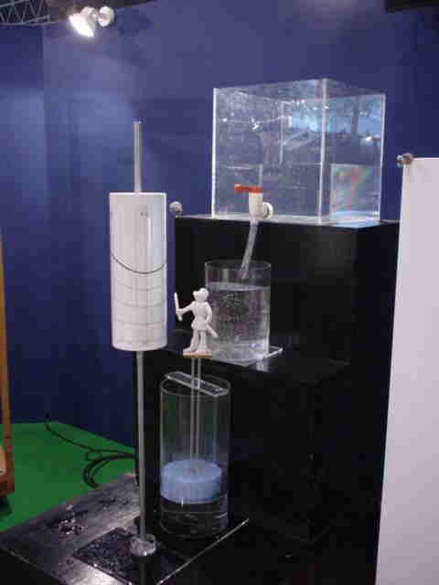 クテシビウス(紀元前3世紀頃・ギリシャの技術者)が「オーバーフロー装置」を用いて一定の流量で水槽に貯まる水によって、その浮力で人形が時刻(目盛りは日時計に合わせたものになっている)を指すようになっています。 「オーバーフロー装置」・・・・水の入った容器の余分な水を溢れさせる(オーバーフロー)と水深が一定になり、容器の下に開けられた口から常に一定の水圧に保たれた水が流れ出ます。