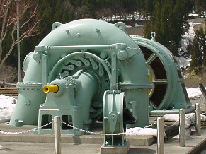 この水車・発電機は、1926(大正15)年から群馬県の吾妻川最上流の東京電力・鹿沢発電所で66年間運転されていましたが、1992(平成4)年発電所の改造工事に伴い撤去となったものです。