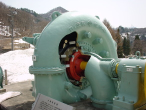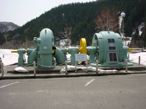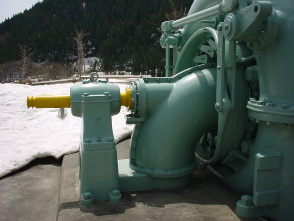| 水車仕様 水車型式 横軸単輪複流渦巻フランシス水車 有効落差 105.9m 最大出力 3580kw 最大流量 4.16立方メートル/秒 回転速度 600rpm |