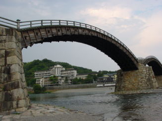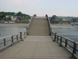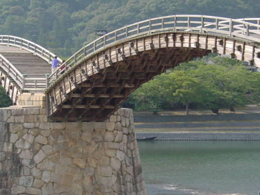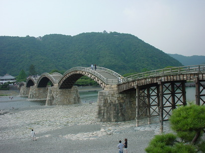 山口県岩国市の錦川に架かる5連の木造反り橋(中央3連がアーチ橋、両端が桁橋)で、日本三奇橋の一つです。