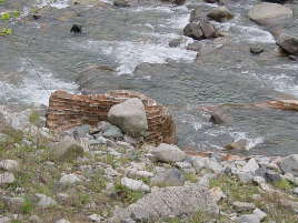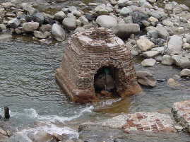 渡良瀬川に残る間藤水力発電所煉瓦造基礎の一部