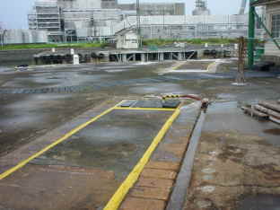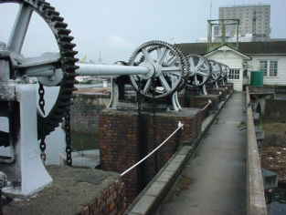 三池港の大きな特徴である閘門式水門は、有明海の干満差が5.5m以上もあるため、閘門によって有明海と渠内を仕切ることができ、水位を一定に保つことによって干潮時でも大型の船が着岸できるように造られた施設です。この水圧式水門によりドック内は常時8.5mの水深を維持でき、1万tクラスまでの荷役が可能になりました。水門は、パナマ運河と同じ様式で作られています。