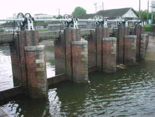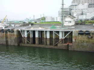 この扉の遮水を確実にするため、接着面には木材を用いていますが、その材料は船虫など虫害に強く、比重の思い南米産グリーンハートという特別な材を用いました。この用材の予備を渠内の水中に保管して置きましたが、昭和56年に引き上げてみたところ、76年も経過していたにもかかわらず十分に使用に耐え得る状態でした。また、大型船が渠内に入港したときに海水を逃がす「スルースゲート」が閘門式水門の両側に設置されています。