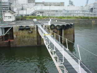 三池港・閘門式水門は幅20mの水路に設置された2扉観音開き(2枚のイギリス製の鋼鉄製門扉)で、水圧シリンダーで開閉する鉄製箱形の扉。門の高さは8.5m、底は渠内の底に合わせてあるので、門を閉じると渠内の水深は8.5mとなります。この水面の上面をドッグノルマル(DN)といい、これは三池港の中等測位(MWL)から約40cm高い位置に当たります。