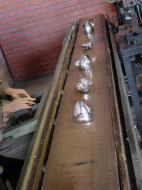 旧・三洋電機製作所・北條製造所は煉瓦造で、内部は鉄骨で補強されていたということです。当時は工場の入口近くに素材倉庫があって、プレス材の裁断が行われていました。当時は素材の入手難により、真鍮帯板も所定寸法に切断しなければならず工程が増え、素材の歩留まりも低下していました。所定の寸法に裁断された素材は次の部品工場に送られました。絞り作業を円滑にするために石けん水に浸された素材は部品工場内1列に並んだプレス機械で、プレスされていきました。プレス工程では先の曲がった特殊ペンチを使用して、プレス加工の敏速性や安全性の向上をはかっていました。プレスの縁取り等にも特殊なチャックが使われていたということです。ランプの反射板等も銀メッキが施され、メッキの下工程では焼戻し、表面仕上(ローレット)、バフ磨きが行われていました。各工程で加工された部品は運搬箱に入れられてラインからラインへ運ばれていきました。