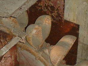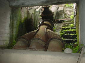 水圧鉄管を流下してきた水は、3分割されて、1つはフランシス水車へ、その他の2つはペルトン水車へ導かれています。
