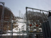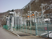 変圧器(屋外用三相油入自冷式変圧器)が並んでいます。ここでは地下発電所からの11000ボルトが変圧器で154000ボルトに昇圧されて送電線へと送られています。この変圧器の出力は2台で48000キロボルトアンペアです。