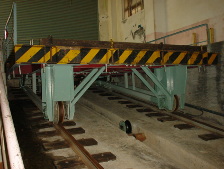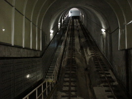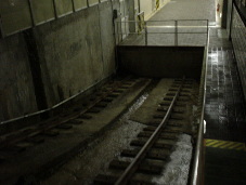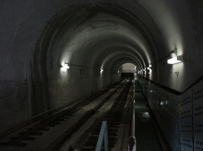 発電所の建設用通路がそのまま発電用機器搬入出用のインクラインとなっています。トンネルの右側壁面には地下発電所の発電機から11000ボルトのケーブルが地上へとつながっていました。インクラインの台車用レールの中央には地下水の排水溝があります。発電所内の機器のためにエアコンで湿度約60%に保たれているそうです。