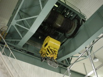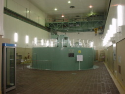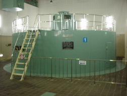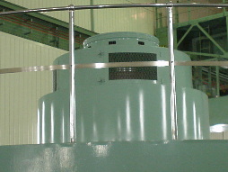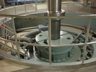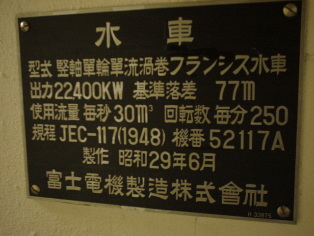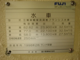 この発電機(立軸傘型発電機)は、水車(立軸渦巻フランシス型水車)と主軸によって連結されていて、毎分250回転し23100キロワットの電力(30アンペア契約の一般家庭約1万軒分)をつくりだしています。