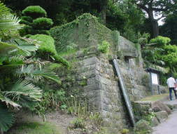 薩摩藩29代島津忠義が建造した工場、「就成所」(しゅうせいじょ)の送電発電用貯水漕(貯水槽)跡です。落差を利用して水車を回転させ、電力を得るというしくみで、1892(明治25)年からはこの電力を使って邸内や庭のアーク灯に明かりを点し、就成所から邸内へ通じる自家用電話にも利用していました。(「集成館」でも当時すでに、水力発電が実現しており、庭園背後の山の尾根伝いに導水路が残っています。)