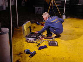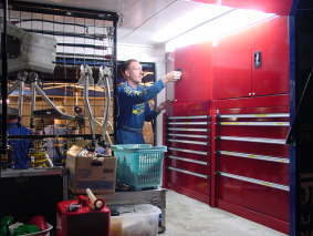 サービスを終えたメカニックたちは工具や部品類を手際よく片づけていきます。